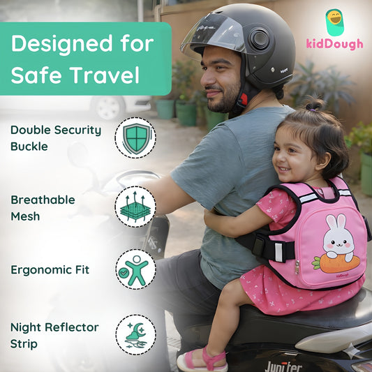 KidDough Baby Safety Belt for Two Wheeler Bike/Scooty | Harness Safety Belt for Kids Safety | Strong Buckles with Adjustable Straps and Double Stiching for Extra Safety (With Storage (Pink))