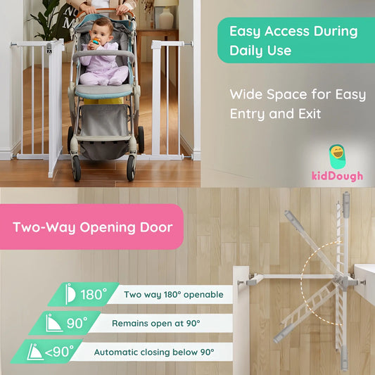 Keep your little one and pets safe with KidDough™ Baby Safety Gates. Designed for doorways, stairs, and wide openings, these sturdy gates feature easy installation, adjustable widths, and a secure double-lock system for maximum protection.