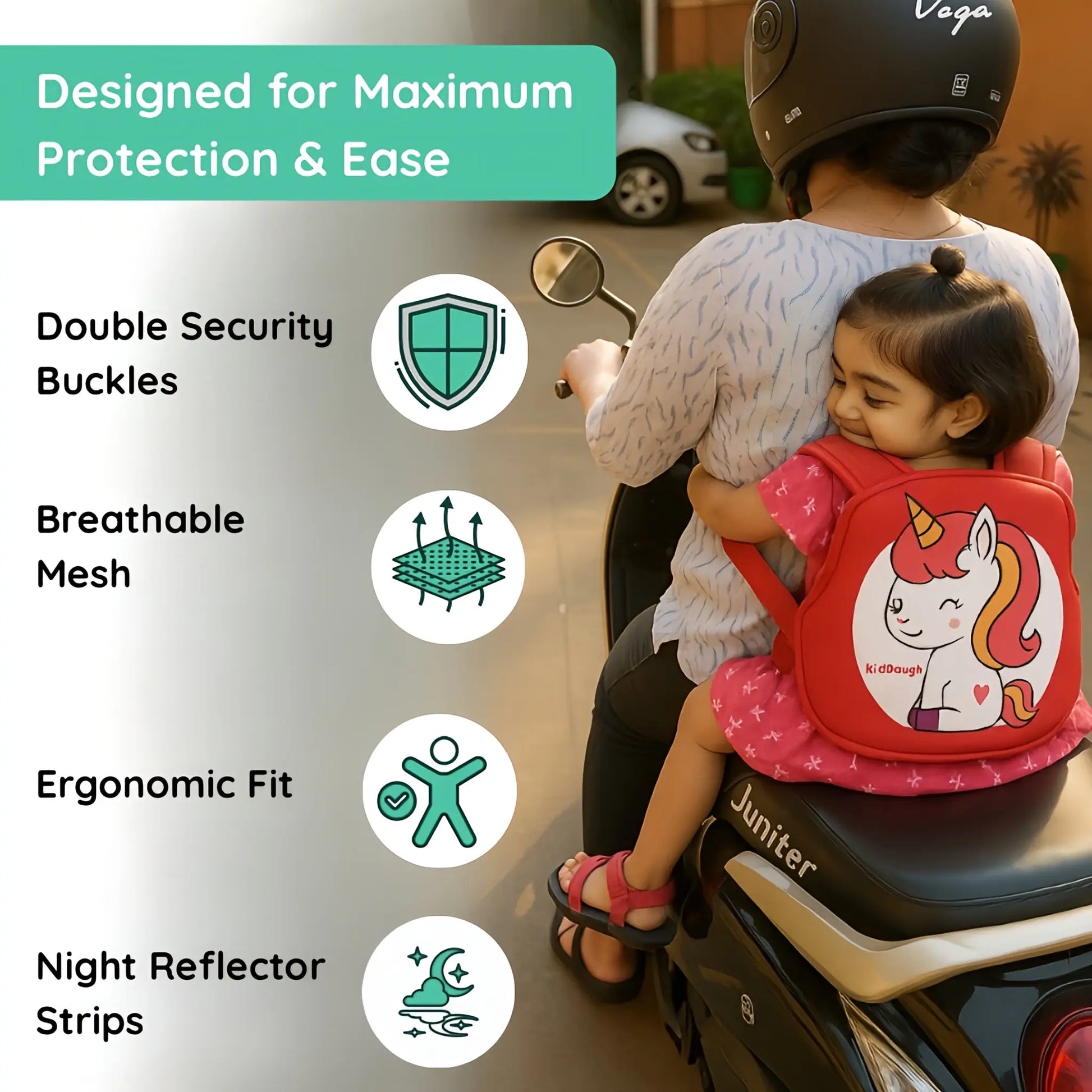 Secure Fit with Extra Safety– Designed to firmly hold your child while riding a two-wheeler, ensuring maximum protection. Strong durable materials with double stitching give utmost safety for your little kiddough.